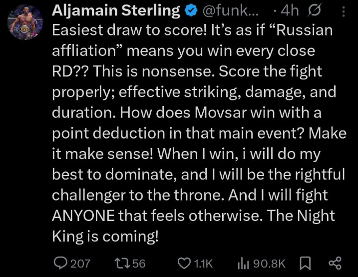 Aljamain Sterling went on X and didn't hold back. "Easiest draw to score! It's as if 'Russian affiliation' means you win every close round??" That's a former champion publicly questioning whether nationality influenced the judges. That's a strong accusation.
