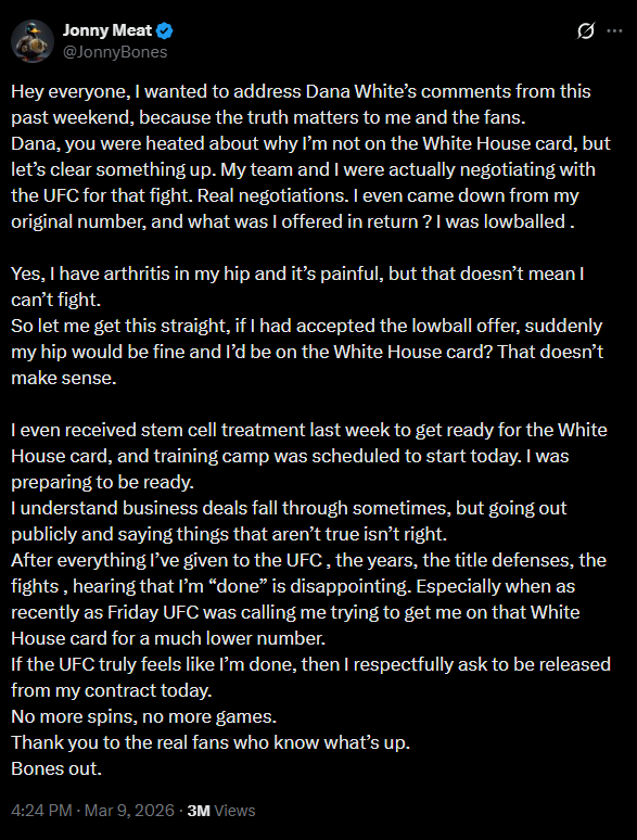He ended it by saying if the UFC truly thinks he's done, he respectfully asks to be released from his contract. "No more spins, no more games. Thank you to the real fans who know what's up. Bones out."