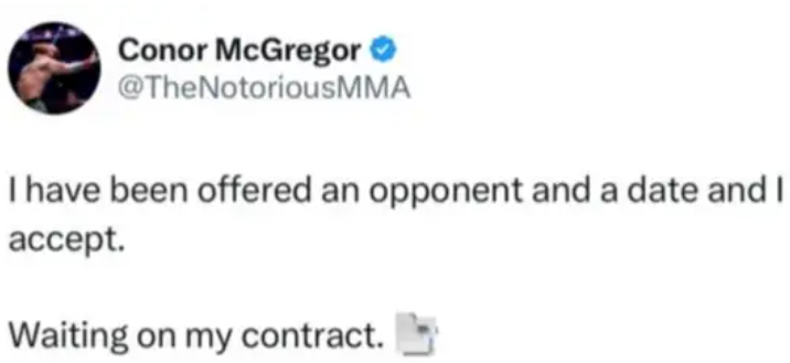 Then, almost on cue, McGregor drops his tweet. No opponent named. No date specified. Just "I accept. Waiting on my contract." And then he deletes it.